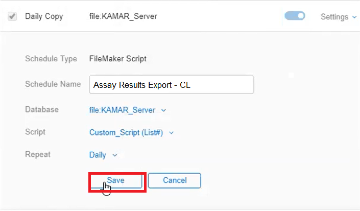 Save Assay Results Export – CL schedule
